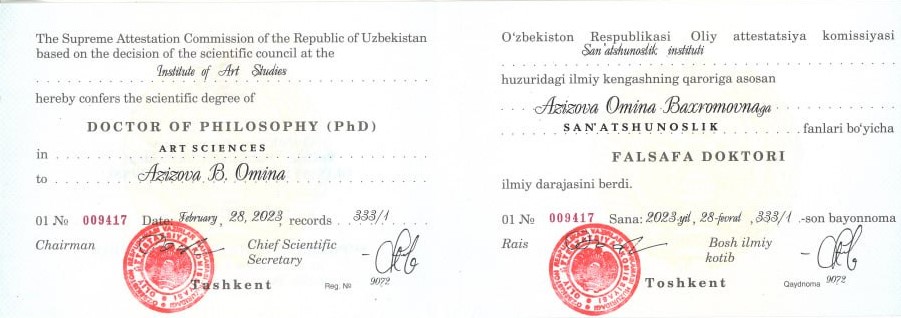 O‘zbekiston Respublikasi Fanlar akademiyasi, San‘atshunoslik instituti "Teatr san'ati va xoreografiya" bo'limi tayanch doktoranti Azizova Omina Bavromovna san'atshunoslik fanlari doktori Ildar Asqadovich Muxtorov ilmiy rahbarligida "O'zbekiston kino san'atining rivojida teatr aktyorining o'rni va ahamiyati" mavzusida ilmiy ishini muvoffaqiyatli himoya qildi.